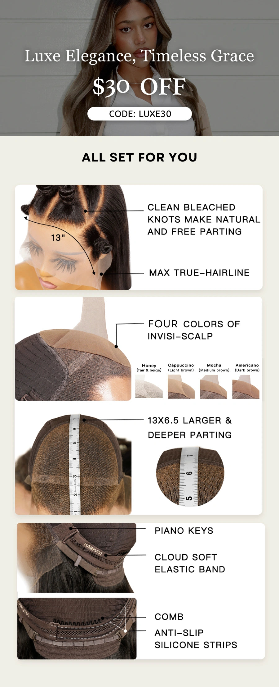 Cappuccino fake scalp color fits most skin tones.
