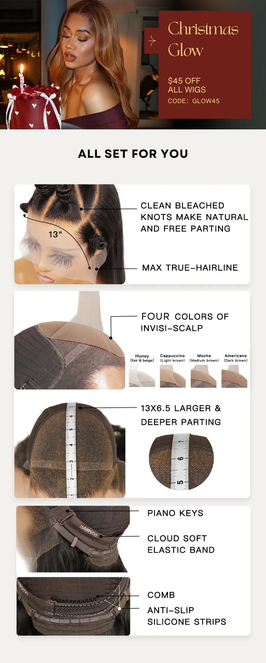 Die vorgefertigte künstliche Kopfhaut lässt sie sehr natürlich aussehen. Es verfügt außerdem über einen vorgezupften Haaransatz und gebleichte Knoten, was eine einfache Installation ermöglicht. Außerdem ist ein Gummiband angebracht, damit die Perücke sicher sitzt. Sie müssen nur noch die Spitze abschneiden und anziehen!