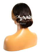 Adorned with delicate silver leaves and luminous pearls, this hair vine adds a touch of bohemian beauty to wedding hair. Wear as a bridal halo, weaved into a braid, or wrapped around a bun. This hair vine is perfect for brides looking for a striking yet delicate accessory.